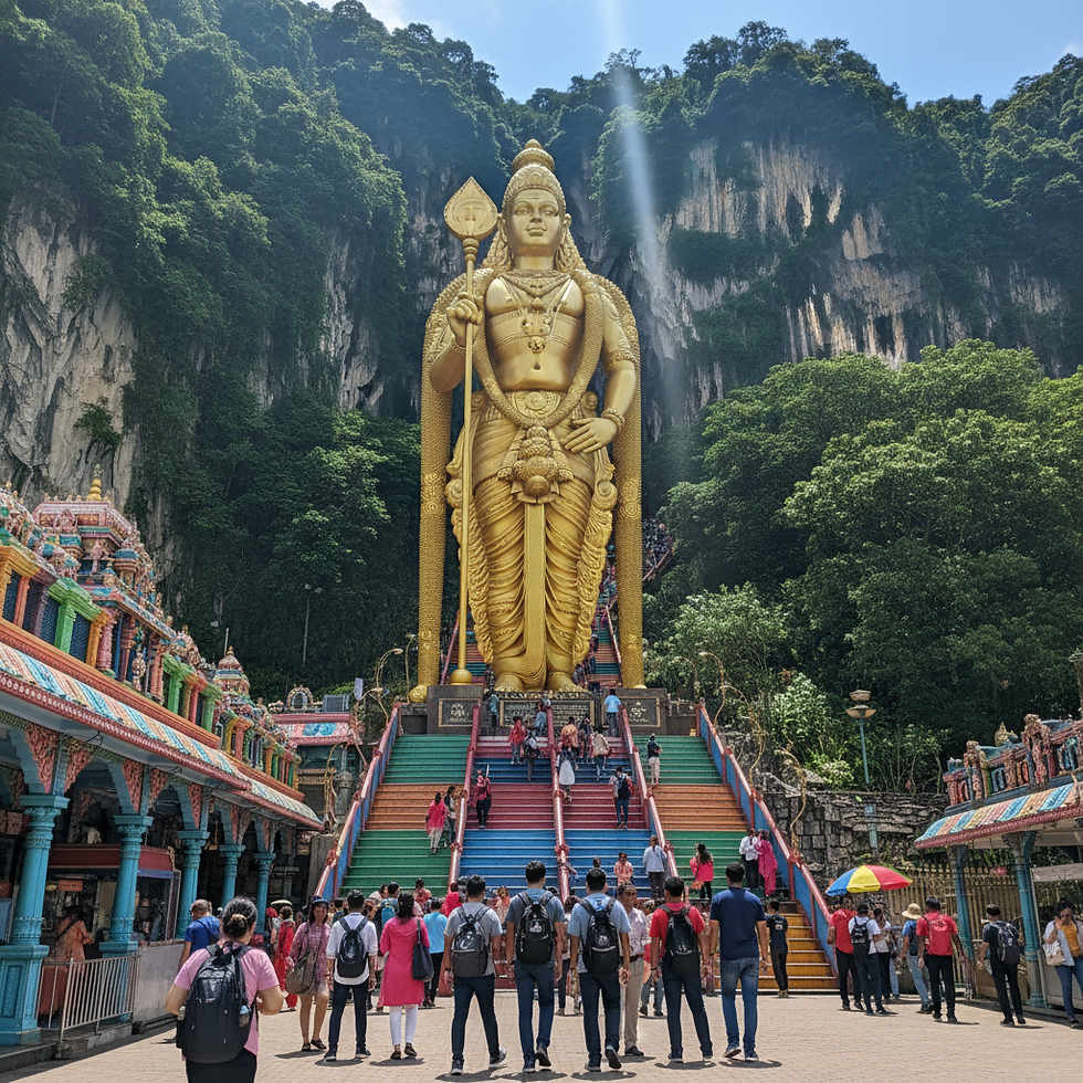 Just a short train ride from the city center lies one of Malaysia’s most revered Hindu shrines and a must-see for any visitor. The Batu Caves are a series of limestone caves and temples that will leave you in awe. Your arrival is dominated by the colossal, 140-foot-tall golden statue of Lord Murugan, the Hindu god of war, standing guard at the entrance. It's one of the tallest Hindu deity statues in the world.